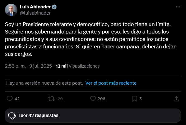 Ámbito RD- El presidente Luis Abinader advirtió este miércoles a todos los funcionarios del gobierno que no podrán hacer campaña desde sus cargos públicos relacionados con los procesos internos del Partido Revolucionario Moderno (PRM).
