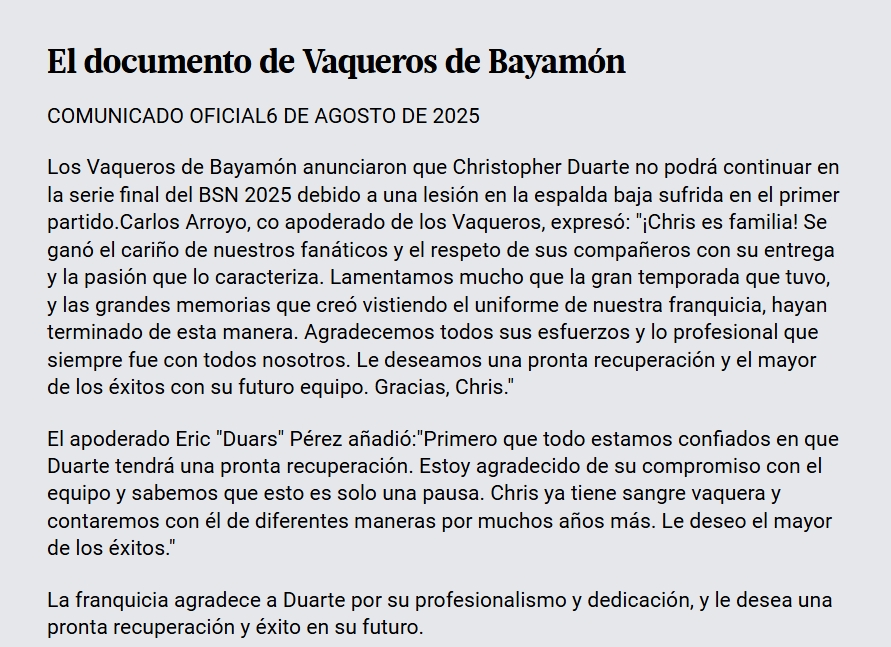 Ámbito RD- El escolta dominicano Chris Duarte no podrá continuar en la serie final del Baloncesto Superior Nacional (BSN) con los Vaqueros de Bayamón, debido a una lesión en la espalda baja sufrida en el primer partido ante los Leones de Ponce.
