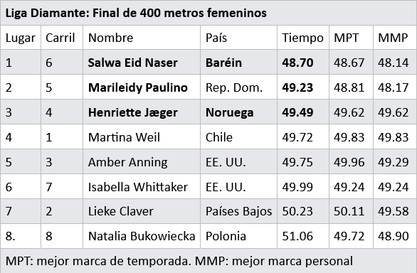 Salwa Eid Naser se impone ante Marileidy Paulino en la final de los 400m de la Liga Diamante
