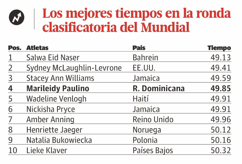 Naser llega al Mundial como la más rápida de la actual temporada (48.67), seguida de Paulino, que tiene el segundo mejor registro de 2025 (48.81).
