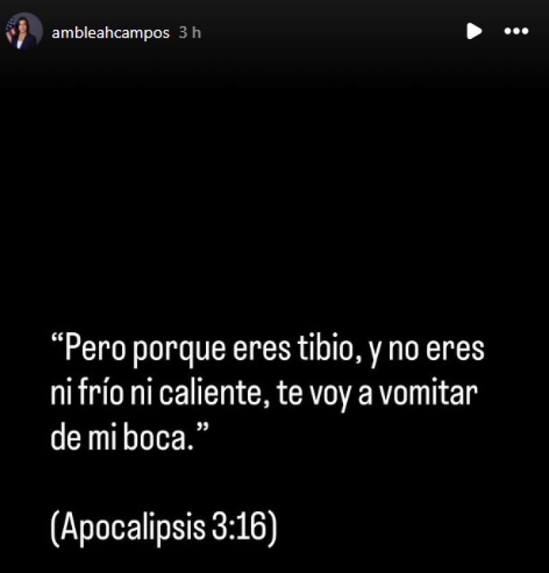 En otra publicación, citó un pasaje bíblico de Apocalipsis 3:16: “Porque eres tibio, y no eres ni frío ni caliente, te voy a vomitar de mi boca”.