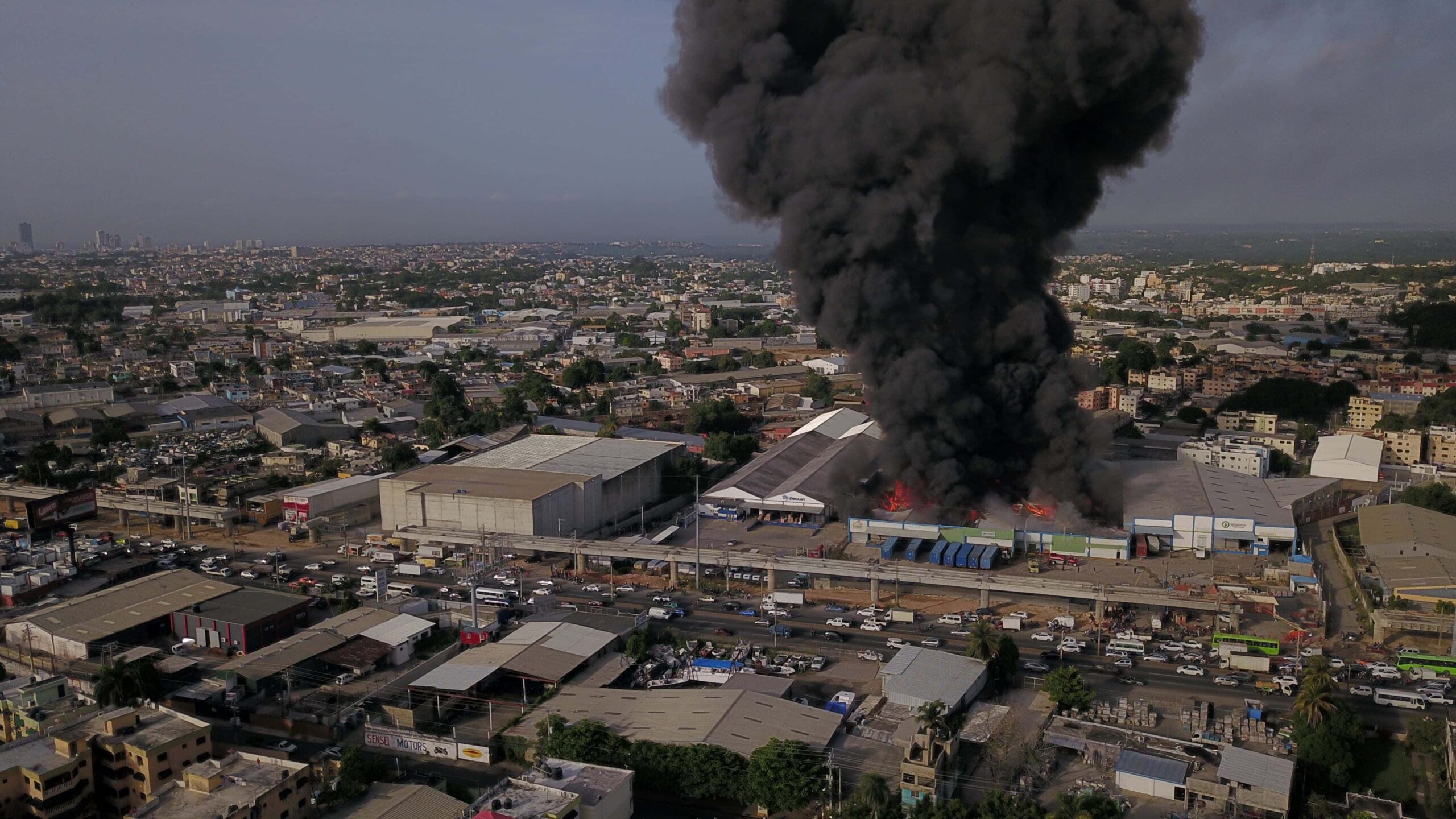 Bomberos de Santo Domingo Oeste y del Distrito Nacional continúan batallando para sofocar las llamas de la empresa Parkdate que se incendió pasadas las 7:00 de la mañana.