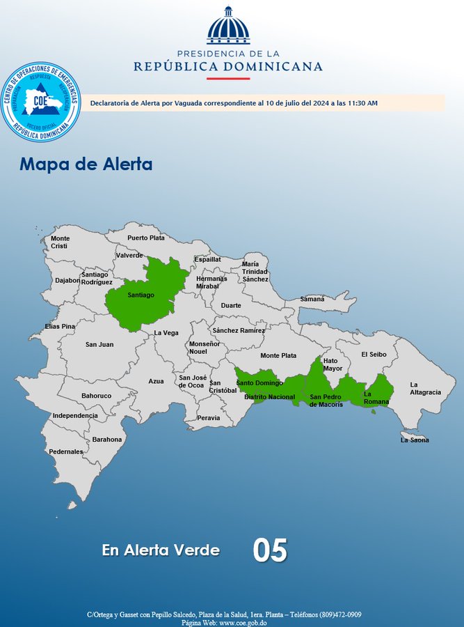 En total son cinco las provincias en alerta, todas en verde. De estas, cuatro están en el litoral costero caribeño (Santo Domingo, Distrito Nacional, San Pedro de Macorís y La Romana) y una en el Cibao, que es Santiago.
