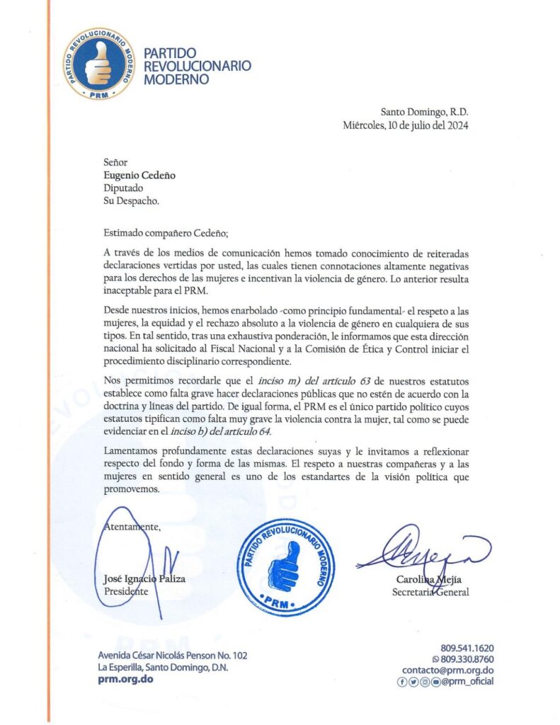Nos permitimos recordarle que el inciso m) del artículo 63 de nuestros estatutos establece como falta grave hacer declaraciones públicas que no estén de acuerdo con la doctrina y líneas del partido. De igual forma, el PRM es el único partido político cuyos estatutos tipifican como falta muy grave la violencia contra la mujer, tal como se puede evidenciar en el inciso b) del artículo 64.