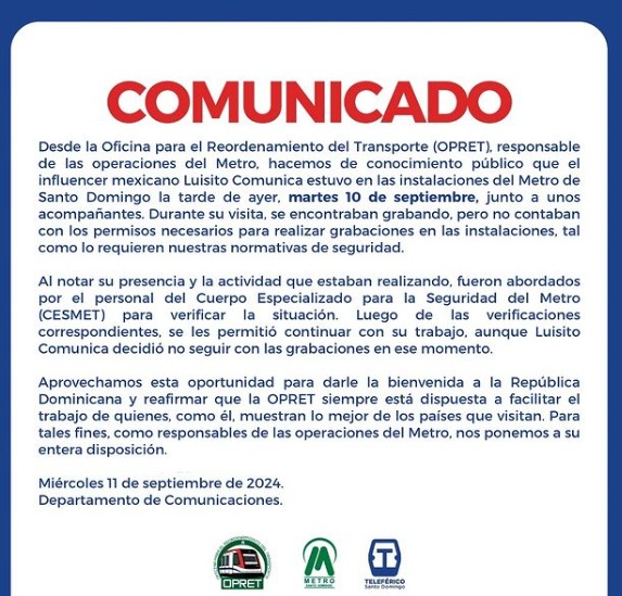 Ámbito RD- La Oficina para el Reordenamiento del Transporte (OPRET) emitió un comunicado dando respuesta a una situación ocurrida este martes en las instalaciones del Metro de Santo Domingo, la cual involucra al influecer mexicano “Luisito Comunica”.