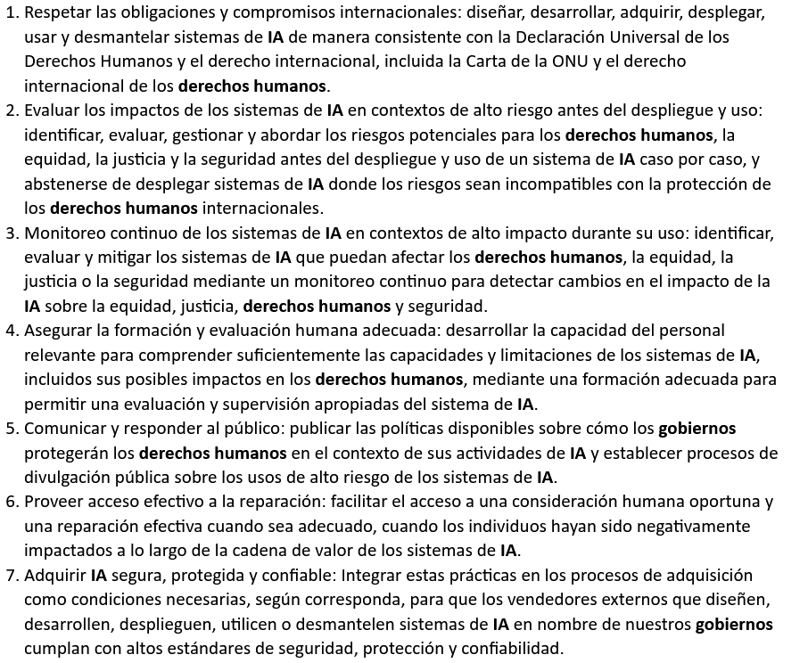Además, establecen que, con la exploración y adopción sin precedentes de herramientas de IA, el momento para que los gobiernos establezcan prácticas y políticas de IA responsables y respetuosas de los derechos humanos es ahora.