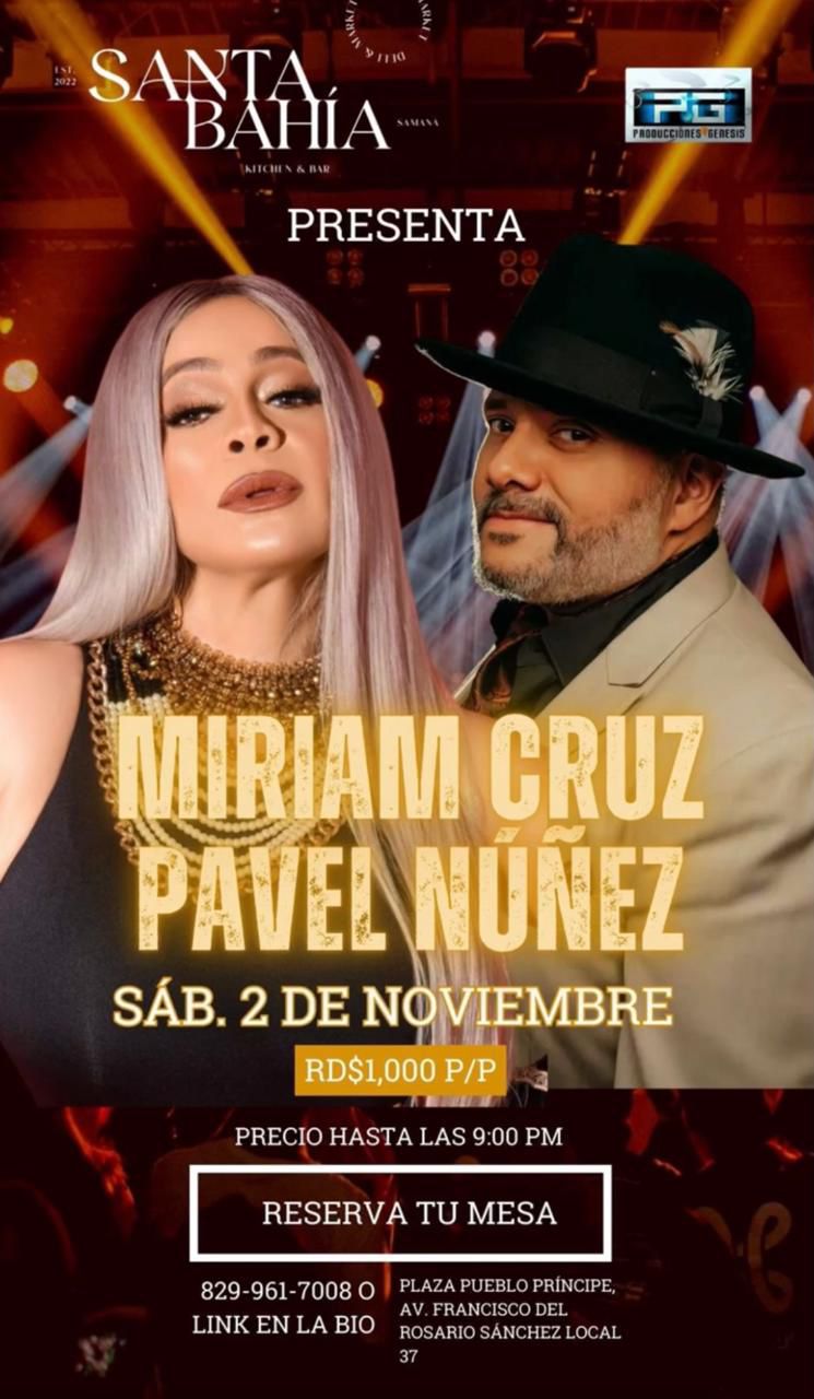 «Nos llena de satisfacción y orgullo poder ofrecer un show con estas dos grandes figuras del arte popular como son Pabel Núñez y Miriam Cruz. Es un evento para que los asistentes disfruten al máximo en nuestro establecimiento y aprovechen el fin de semana largo que se aproxima», destacó Chelín Encarnación, quien es uno de los organizadores de la actividad.