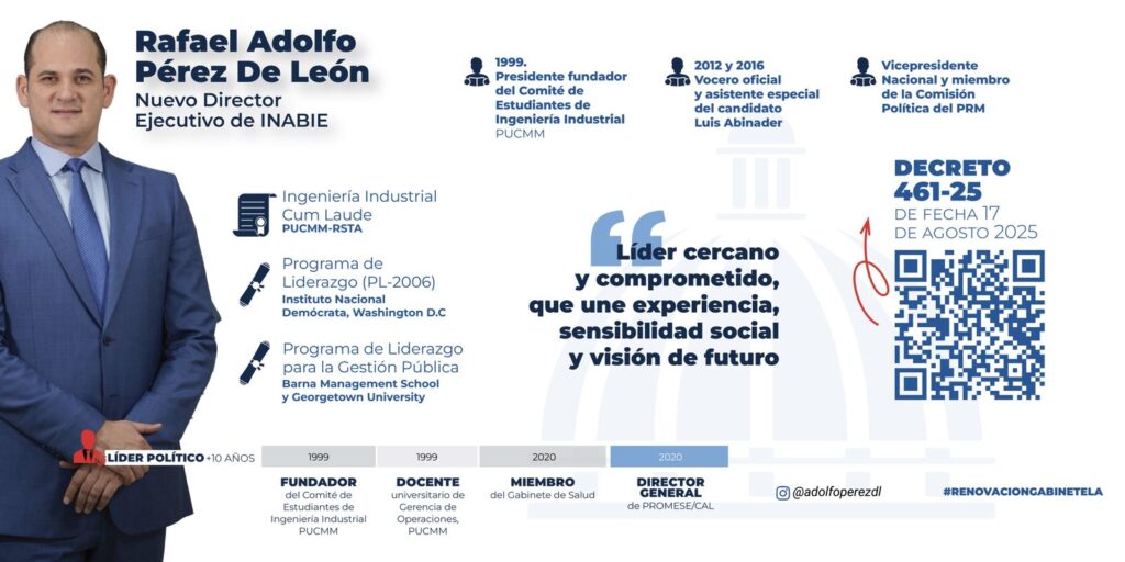 Ámbito RD- Mediante el Decreto 461-25 emitido el 17 de agosto de 2025, el presidente Luis Abinader designó a Rafael Adolfo Pérez de León como nuevo director ejecutivo del Instituto Nacional de Bienestar Estudiantil (INABIE).