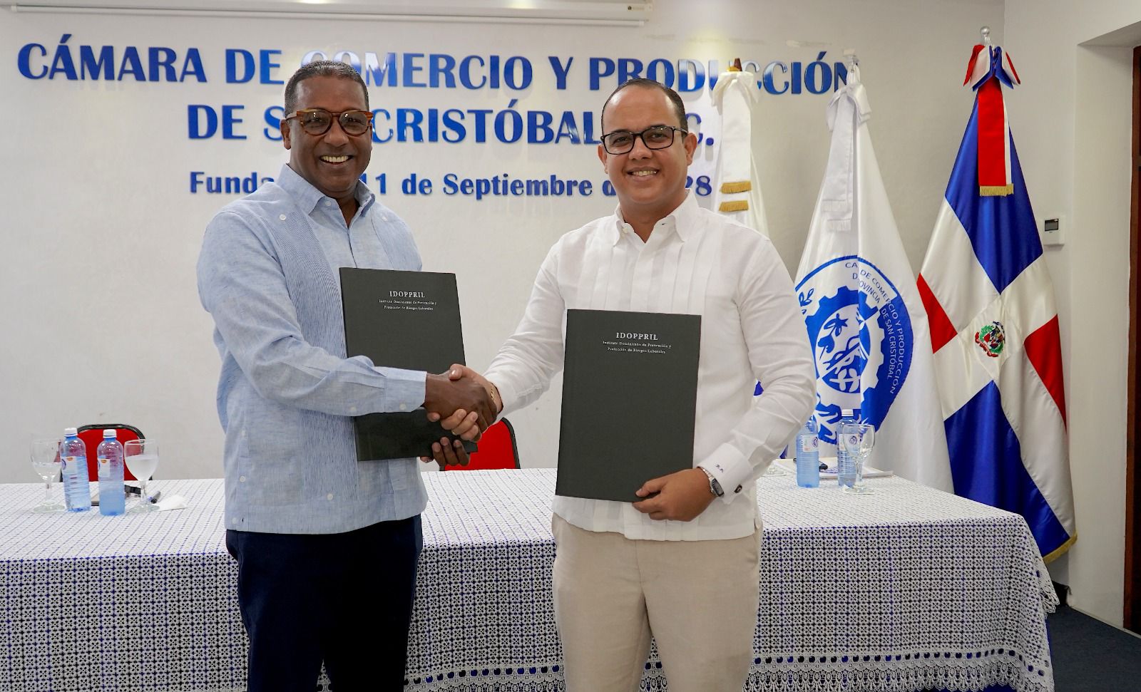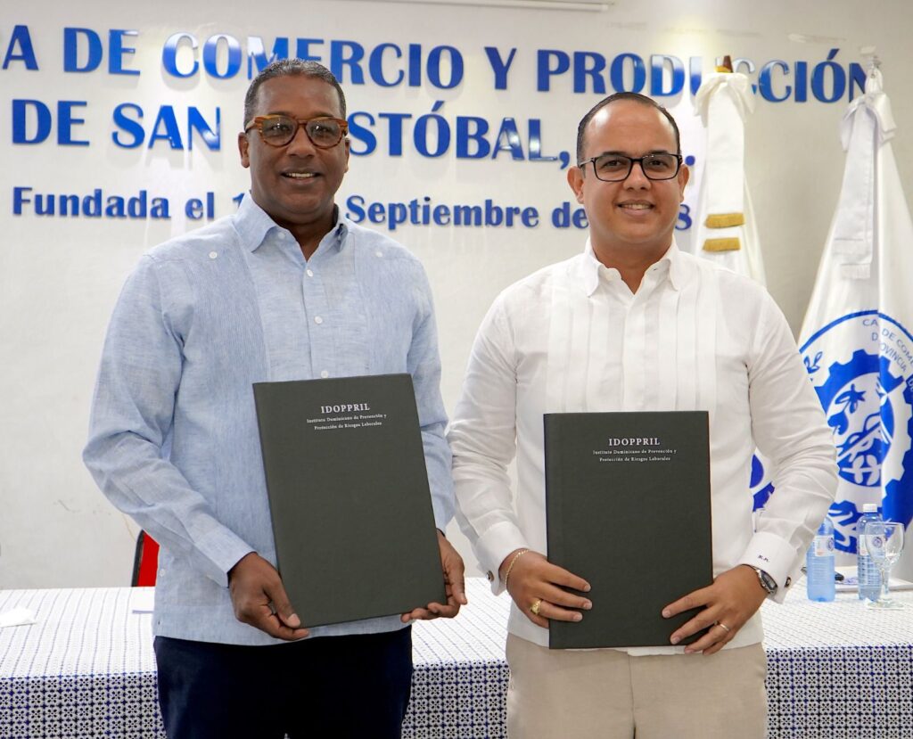 Ámbito RD- El Instituto Dominicano de Prevención y Protección de Riesgos Laborales (IDOPPRIL) y la Cámara de Comercio y Producción de San Cristóbal suscribiendo un convenio para desarrollar acciones conjuntas orientadas a promover la seguridad ocupacional en las empresas de esta provincia.